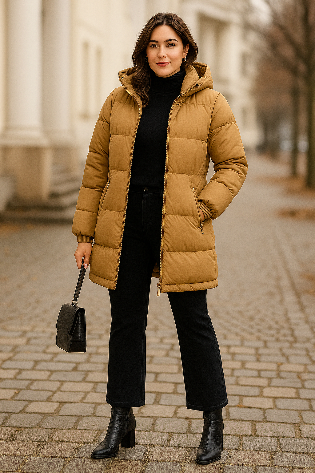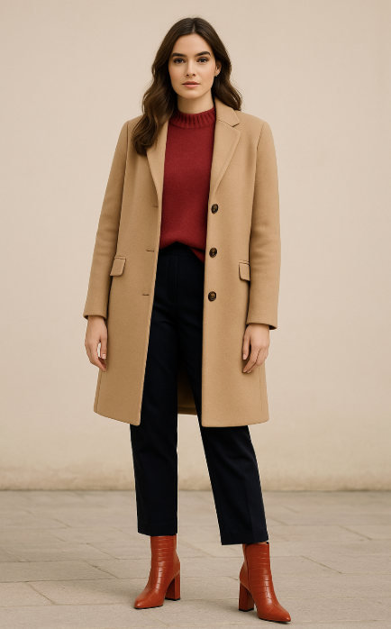 A classic and refined outfit featuring warm wool pieces for effortless comfort during the colder months. The camel wool coat, soft knit sweater and brown accents create a balanced, feminine and timeless look — perfect for the season.